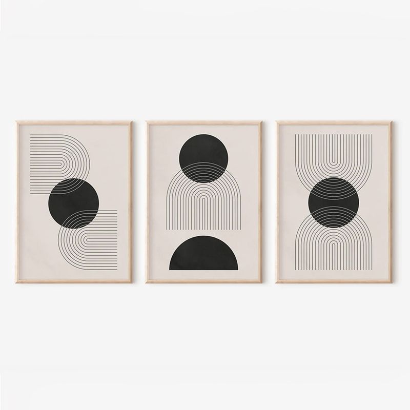 Αυτή η τριπτυχική σύνθεση είναι ιδανική για όσους αναζητούν έναν εντυπωσιακό και μοντέρνο πίνακα με έντονη αντίθεση. Οι αφηρημένες γεωμετρικές μορφές σε μαύρο χρώμα, σε συνδυασμό με τους απαλούς, γήινους τόνους του φόντου, δημιουργούν μια δυναμική και σύγχρονη αισθητική.