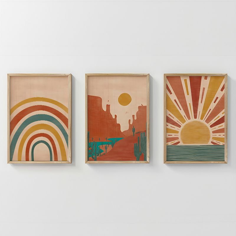 Εισάγετε στον χώρο σας ένα χαρούμενο, αισιόδοξο κλίμα με ρετρό αίσθηση, ιδανικό για να δώσει ζεστασιά και χρώμα. Το τρίπτυχο Jecko αποτελείται από τρία ξεχωριστά, δυναμικά τεμάχια, όλα βασισμένα σε μία γήινη, ρετρό χρωματική παλέτα. Αυτή η τριπλή διάταξη προσδίδει παιχνιδιάρικο ρυθμό, ζεστή ατμόσφαιρα και υψηλή αισθητική που ταιριάζει ιδανικά σε υπνοδωμάτια, παιδικά δωμάτια ή χώρους εργασίας.