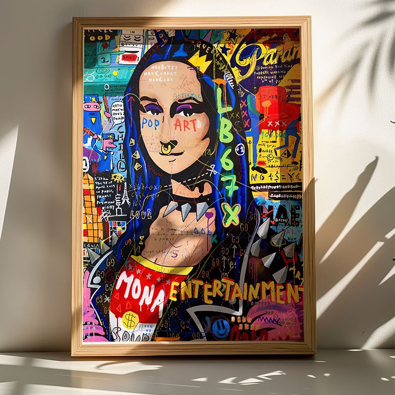 Ο πίνακας Monda είναι ένα εκρηκτικό, Pop-Art και δυναμικό έργο τέχνης που συγκρούει την αριστοκρατία της κλασικής ζωγραφικής με την σύγχρονη κουλτούρα του Street Art και των Graffiti. Απεικονίζεται η κεντρική φιγούρα από το διάσημο έργο του Leonardo da Vinci, "Mona Lisa", σε ένα πολύχρωμο και ατίθασο ρετουσάρισμα. Διατηρούνται τα κλασικά στοιχεία του πορτρέτου, ενώ η έκφρασή της έχει τροποποιηθεί με μοντέρνα και χρωματιστά στοιχεία. Ο πίνακας είναι γεμάτος με έντονα χρώματα, σύμβολα, λέξεις (όπως "ENTERTAINMENT"), και γραμμές που θυμίζουν τοίχο γεμάτο graffiti. Είναι ιδανικός για να λειτουργήσει ως το κεντρικό σημείο εστίασης σε κάθε δωμάτιο, προσδίδοντας προσωπικότητα, ζωντάνια και έναν μοντέρνο/Colorful τόνο.