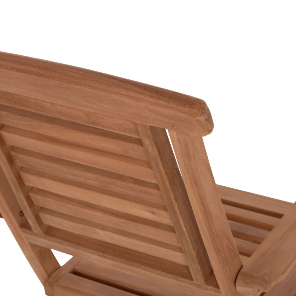 Ο εργονομικός σχεδιασμός με ψηλή πλάτη και μπράτσα εξασφαλίζει άνεση στο κάθισμα, ενώ η φυσική απόχρωση του teak δίνει μια αυθεντική και ζεστή αίσθηση στο χώρο. Ιδανική επιλογή για εξωτερικούς χώρους όπως κήπους, βεράντες και μπαλκόνια.