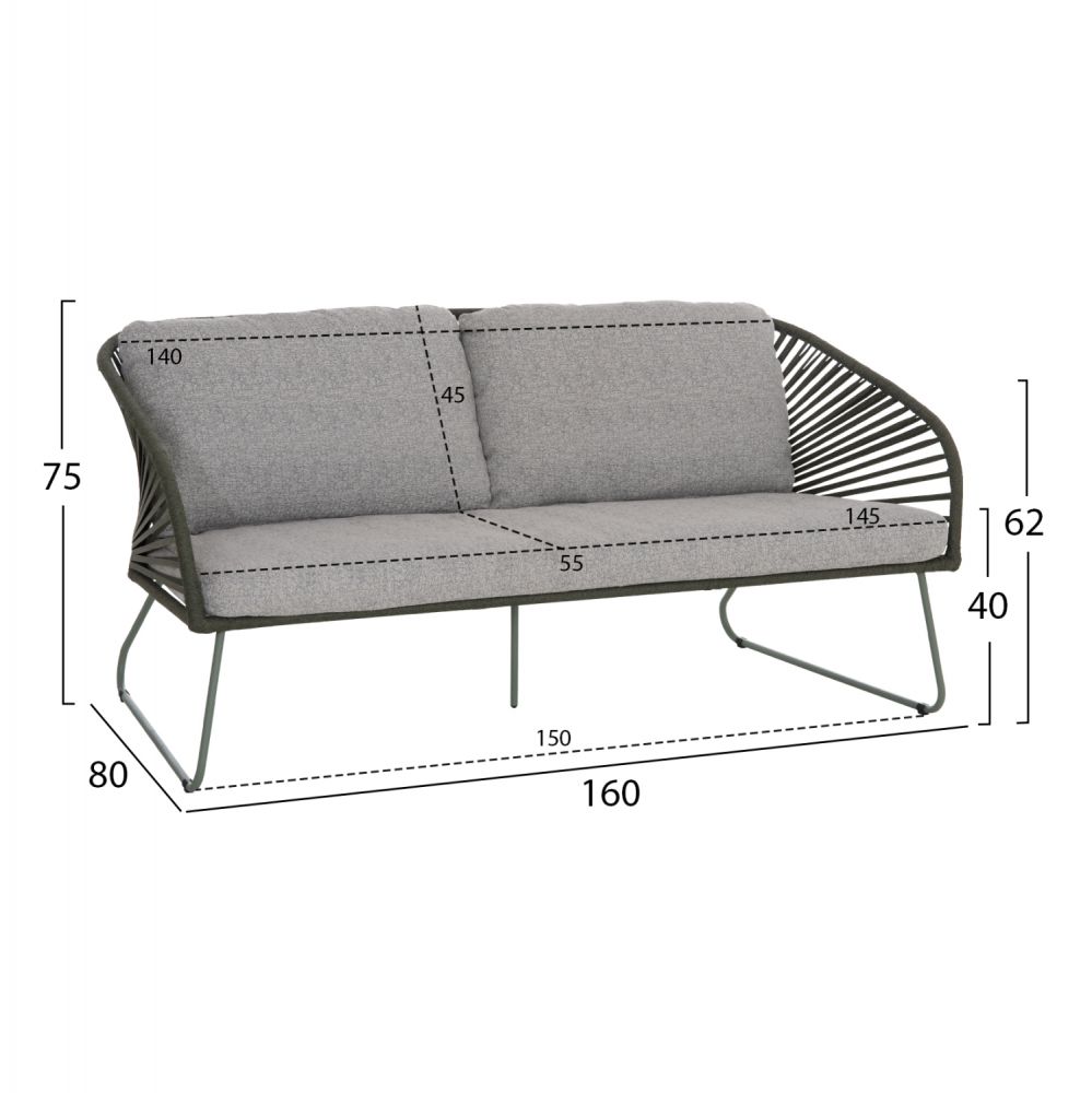 •Καναπές: 160 x 80 x 75Υ εκ----Διαστάσεις καθίσματος: 145x55 εκ.----Διαστάσεις πλάτης: 140x45 εκ.----Ύψος μπράτσου: 62 εκ.----Ύψος καθίσματος: 40 εκ.----Απόσταση ποδιών: 150x75 εκ.