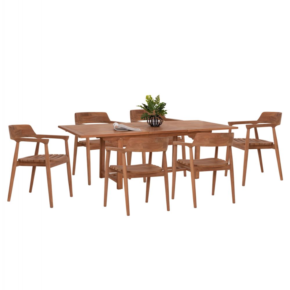 Αυτό το Σετ τραπεζαρίας εξωτερικού χώρου διαθέτει ορθογώνιο ανοιγόμενο/επεκτεινόμενο τραπέζι και 6 πολυθρόνες, όλα κατασκευασμένα από ξύλο TEAK σε ΦΥΣΙΚΟ χρώμα.