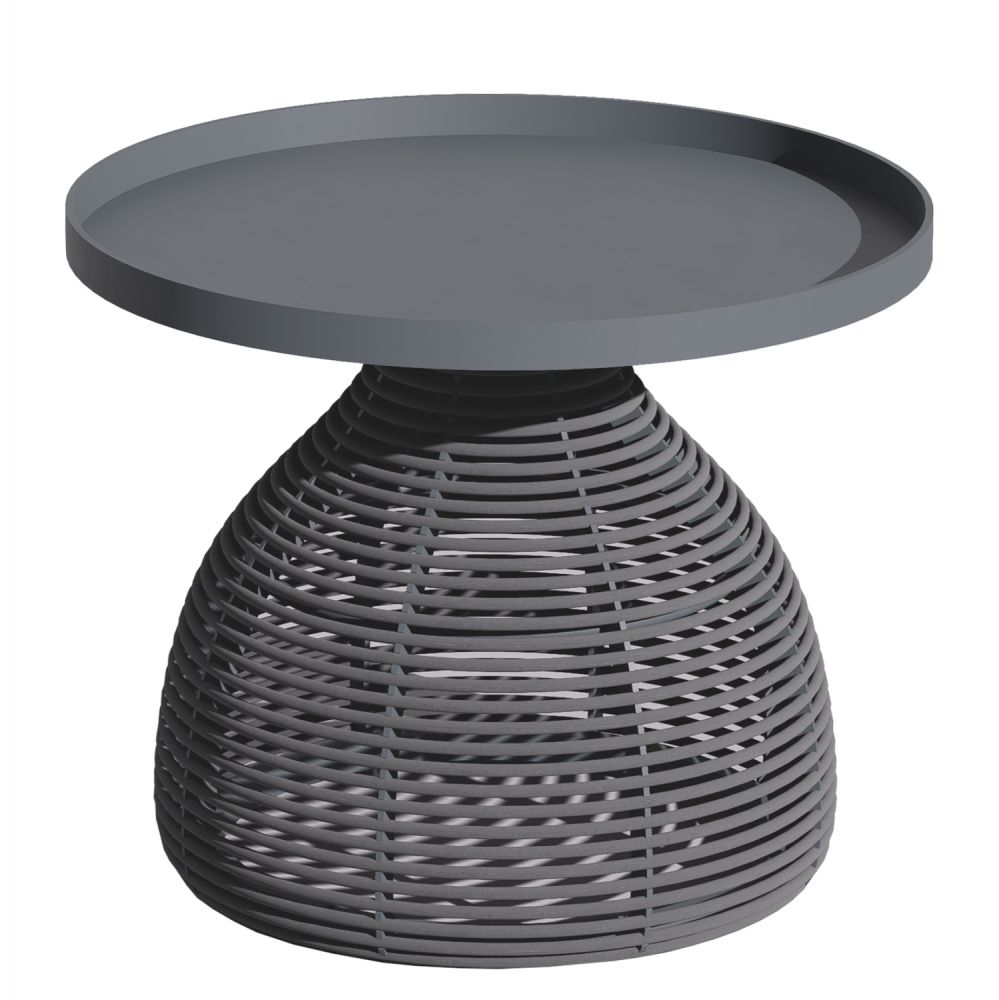 Στρογγυλό βοηθητικό τραπεζάκι εξωτερικού χώρου με επιφάνεια αλουμινίου και κορμό από αλουμίνιο επενδυμένο με σχοινί. Η συνολική κατασκευή σε γκρι απόχρωση προσφέρει σύγχρονη αισθητική ενώ τα υλικά κατασκευής προσφέρουν υψηλή αντοχή στις εξωτερικές συνθήκες.
