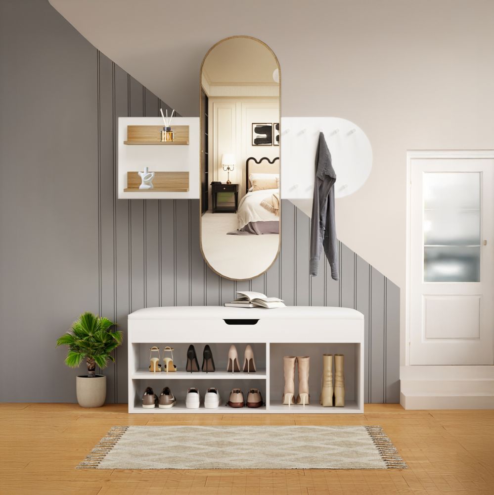 •Μία παπουτσοθήκη σε ΛΕΥΚΟ χρώμα με κάθισμα επενδυμένο με PU δέρμα. Ο χώρος αποθήκευσης είναι ανοιχτός με 2 επίπεδα στην μια πλευρά και έναν μεγαλύτερο στην άλλη για ψηλότερα παπούτσια, ενώ κάτω από το κάθισμα που ανασηκώνεται υπάρχει ακόμα ένας, πιο ρηχός, χώρος αποθήκευσης αντικειμένων.