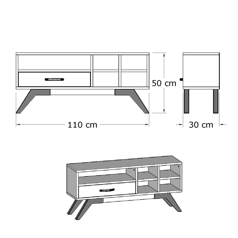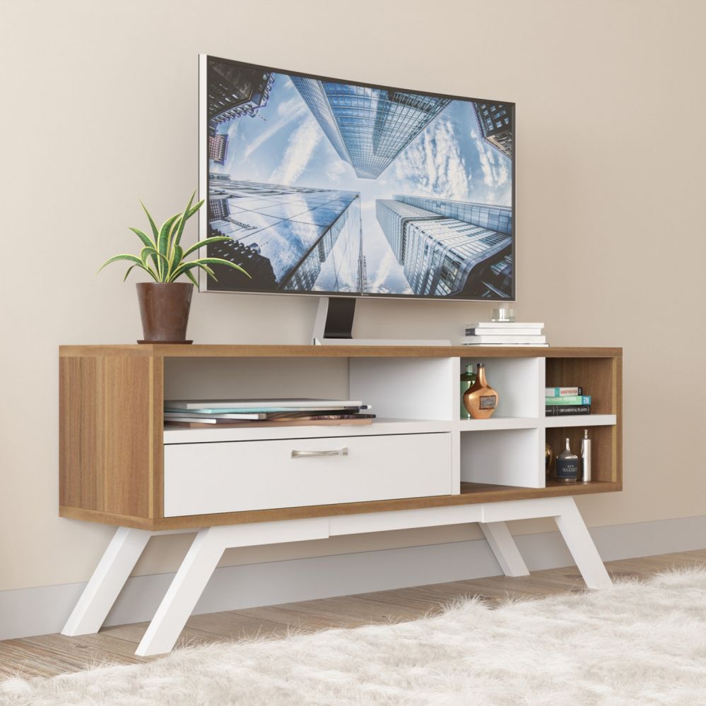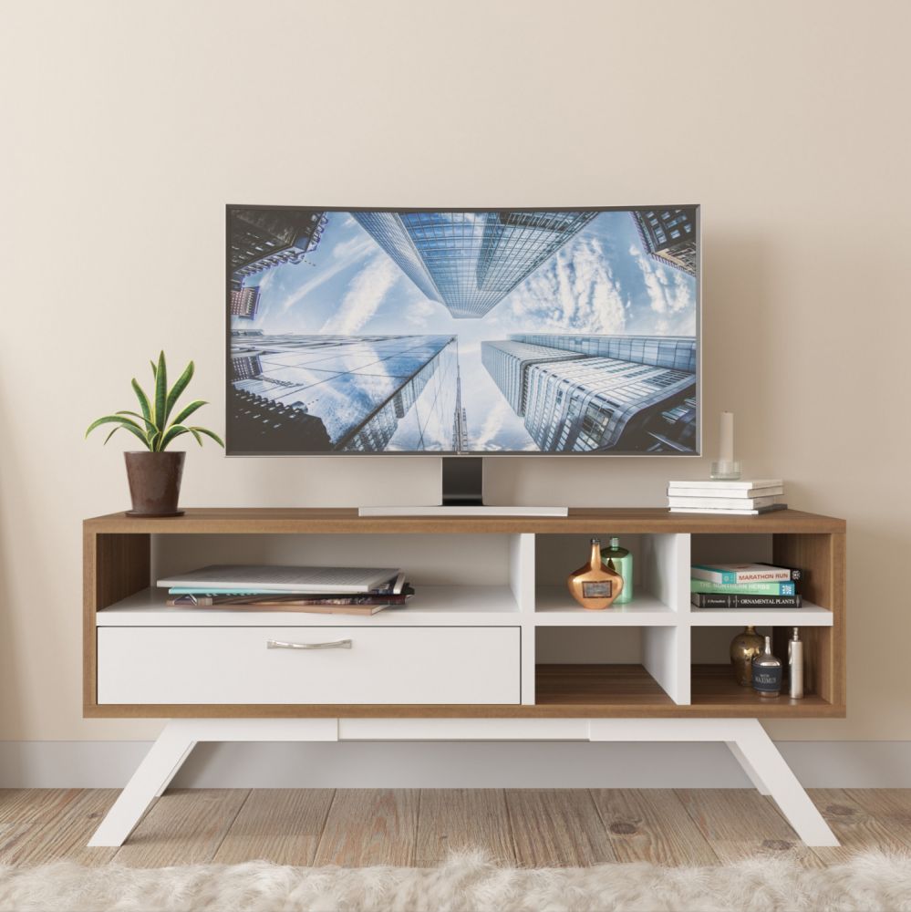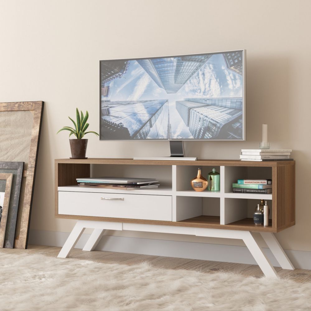Το ΗΜ9314 είναι ένα μοντέρνο και λειτουργικό έπιπλο τηλεόρασης, που θα ομορφύνει το σαλόνι σας! Αποτελείται από δύο σειρές τετράγωνα ραφάκια, ένα πιο μεγάλο και ορθογώνιο ράφι και ένα συρτάρι. Τα πόδια ακολουθούν και αυτά την αισθητική γραμμή της υπόλοιπης κατασκευής. Το έπιπλο έρχεται σε μια πανέμορφη διχρωμία καρυδί με λευκό και οι διαστάσεις του είναι ικανοποιητικές για τις περισσότερες τηλεοράσεις.
