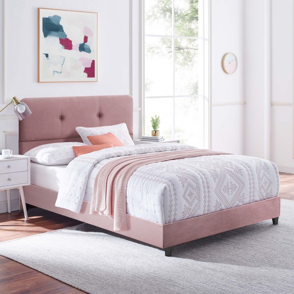 Η επένδυση έχει γίνει εξολοκλήρου από βελούδινο ύφασμα, χαρίζοντας ελκυστική όψη και μια εκλεπτυσμένη γοητεία στην διακόσμηση του υπνοδωματίου. Πρόκειται για ένα ύφασμα απαλό, χαλαρό, απολαυστικό και φινετσάτο που είναι αδύνατον να του αντισταθεί κάποιος. Το θετικό είναι ότι μπορεί να εναρμονιστεί εύκολα με κάθε είδος διακόσμησης, προσδίδοντας στο χώρο φινέτσα και καλαισθησία.