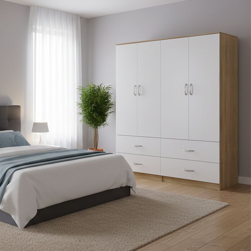 - Περιλαμβάνει τέσσερις πόρτες, εσωτερικά φέρει ράγα για κρεμάστρες ενώ κάτω φέρει τέσσερα μεγάλα συρτάρια για την αποθήκευση ρούχων και αξεσουάρ.
