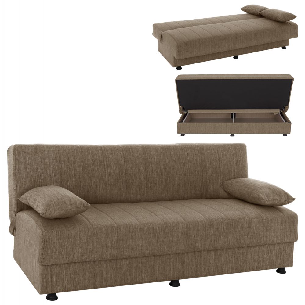 Ξεκινώντας από τα βασικά και τα προφανή, το χρώμα της επένδυσης με το εξαιρετικό και καλοραμμένο ανάγλυφο ύφασμα αυτού του καναπέ, είναι καφέ. Διαθέτει 2 μικρά μακρόστενα μαξιλάρια με το ίδιο ύφασμα που μπορούν να χρησιμοποιηθούν όπως θέλει ο καθένας. Χαρακτηριστικό αυτού του καναπέ είναι ότι δεν διαθέτει μπράτσα με αποτέλεσμα να μην περιορίζει την χρήση του από τους χρήστες του. Επίσης, γίνεται πολύ εύκολα κρεβάτι μέσω ενός εύχρηστου μηχανισμού (κλικ-κλακ) πολλαπλασιάζοντας την χρησιμότητά του. Κάτω από το κάθισμα του καναπέ υπάρχουν 2 αποθηκευτικοί χώροι με ενισχυμένο πάτωμα καθιστώντας τον ένα πραγματικό πολυεργαλείο, ειδικά για φοιτητικά σπίτια αλλά και σπίτια με περιορισμένο γενικά χώρο.