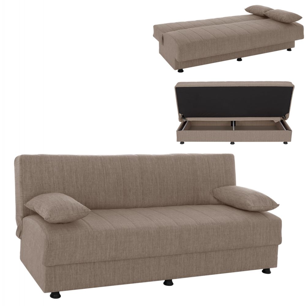 Ξεκινώντας από τα βασικά και τα προφανή, το χρώμα της επένδυσης με το εξαιρετικό και καλοραμμένο ύφασμα αυτού του καναπέ, είναι ΜΠΕΖ. Διαθέτει 2 μικρά μακρόστενα μαξιλάρια με το ίδιο ύφασμα που μπορούν να χρησιμοποιηθούν όπως θέλει ο καθένας. Χαρακτηριστικό αυτού του καναπέ είναι ότι δεν διαθέτει μπράτσα με αποτέλεσμα να μην περιορίζει την χρήση του από τους χρήστες του. Επίσης, γίνεται πολύ εύκολα κρεβάτι μέσω ενός εύχρηστου μηχανισμού (κλικ-κλακ) πολλαπλασιάζοντας την χρησιμότητά του. Κάτω από το κάθισμα του καναπέ υπάρχουν 2 αποθηκευτικοί χώροι με ενισχυμένο πάτωμα καθιστώντας τον ένα πραγματικό πολυεργαλείο, ειδικά για φοιτητικά σπίτια αλλά και σπίτια με περιορισμένο γενικά χώρο.