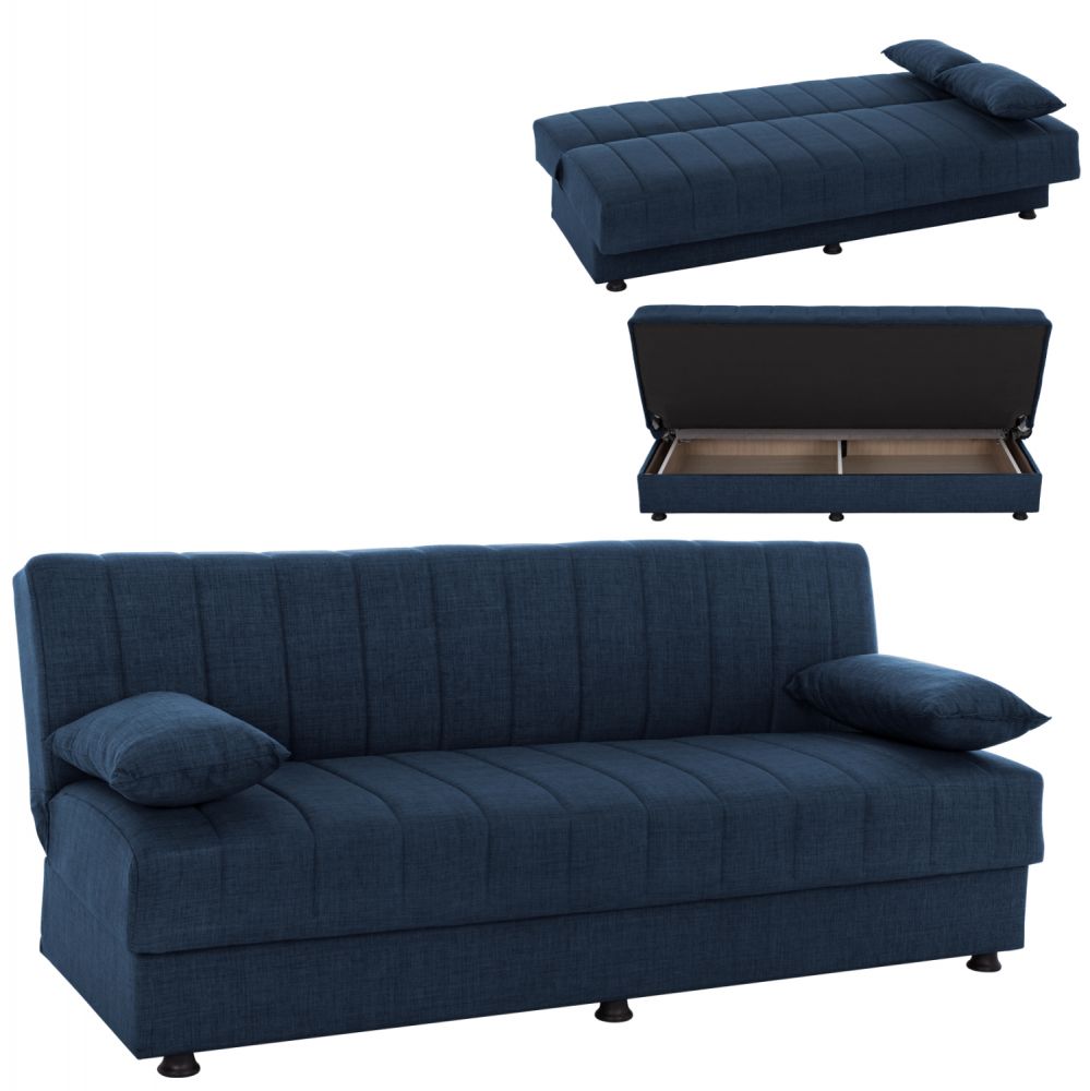Ξεκινώντας από τα βασικά και τα προφανή, το χρώμα της επένδυσης με το εξαιρετικό και καλοραμμένο ανάγλυφο ύφασμα αυτού του καναπέ, είναι ΜΠΛΕ. Διαθέτει 2 μικρά μακρόστενα μαξιλάρια με το ίδιο ύφασμα που μπορούν να χρησιμοποιηθούν όπως θέλει ο καθένας. Χαρακτηριστικό αυτού του καναπέ είναι ότι δεν διαθέτει μπράτσα με αποτέλεσμα να μην περιορίζει την χρήση του από τους χρήστες του. Επίσης, γίνεται πολύ εύκολα κρεβάτι μέσω ενός εύχρηστου μηχανισμού (κλικ-κλακ) πολλαπλασιάζοντας την χρησιμότητά του. Κάτω από το κάθισμα του καναπέ υπάρχουν 2 αποθηκευτικοί χώροι με ενισχυμένο πάτωμα καθιστώντας τον ένα πραγματικό πολυεργαλείο, ειδικά για φοιτητικά σπίτια αλλά και σπίτια με περιορισμένο γενικά χώρο.