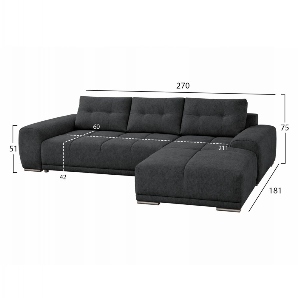 ΚΑΝΑΠΕΣ ΚΡΕΒΑΤΙ ΔΕΞΙΑ ΓΩΝΙΑ COMFYRA HM3336.01R ΓΚΡΙ ΥΦΑΣΜΑ 270x181x75Υεκ