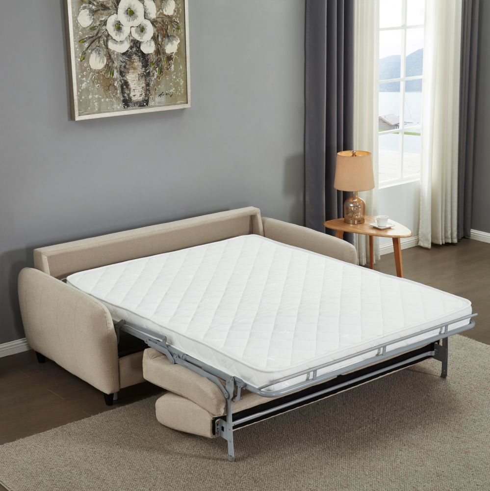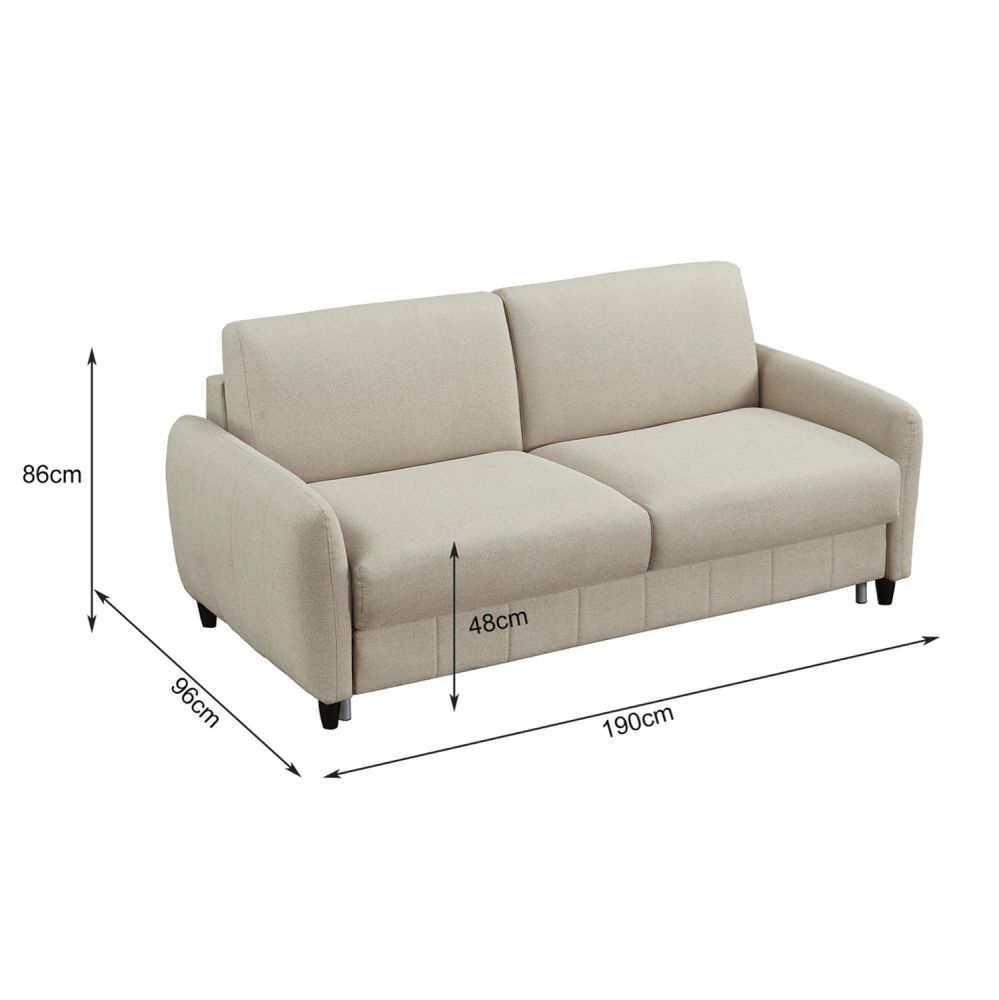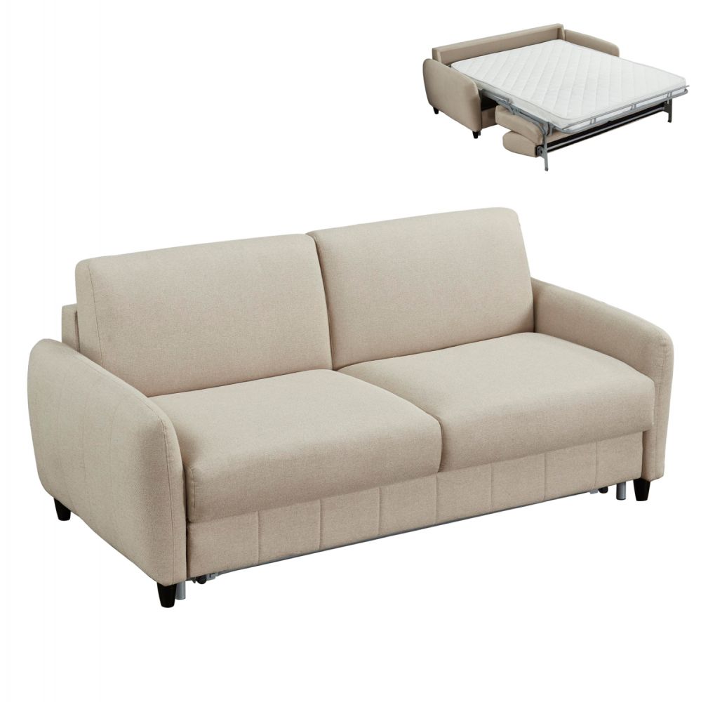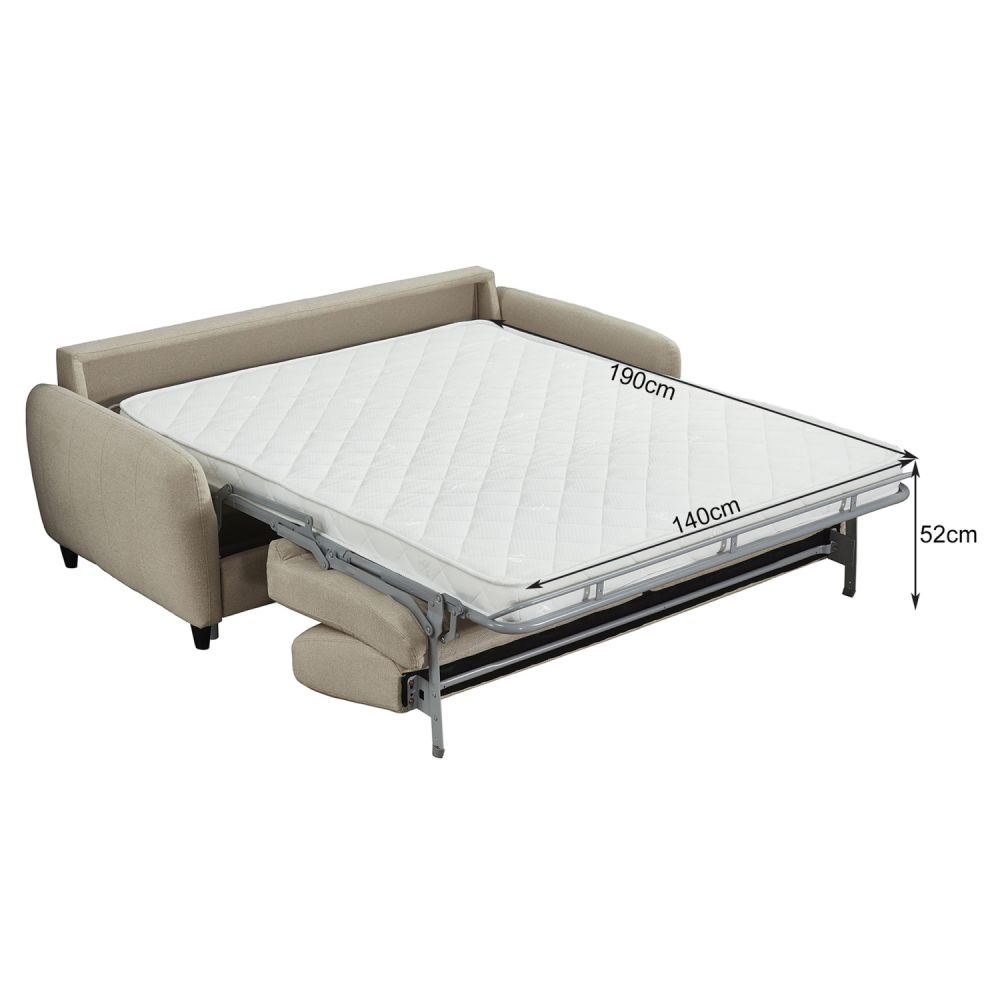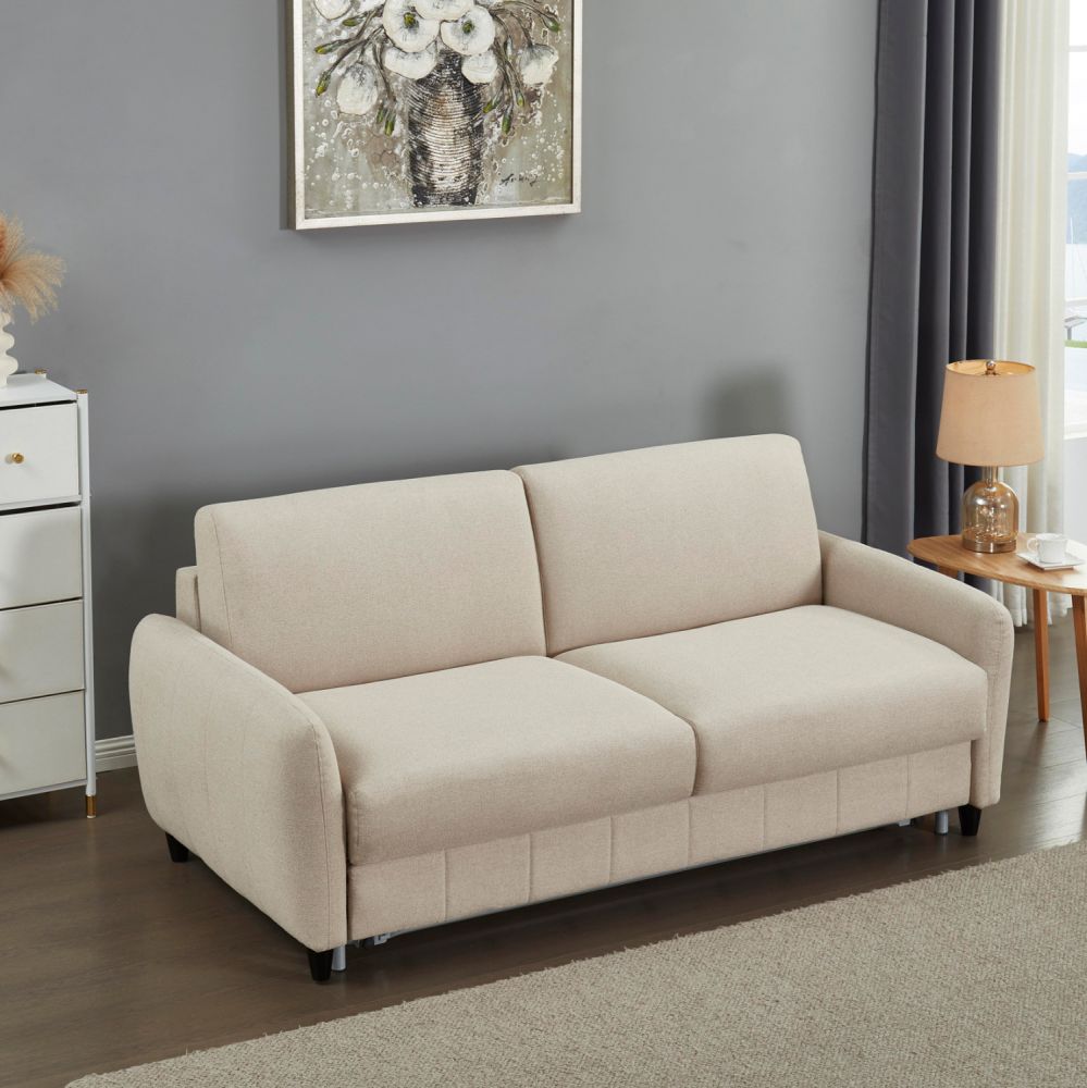 Ο διθέσιος καναπές κρεβάτι ETUDINE είναι μια κομψή και απολύτως λειτουργική επιλογή για κάθε μοντέρνο σπίτι. Η ΜΠΕΖ υφασμάτινη επένδυση, τα στρογγυλεμένα λεπτά μπράτσα και τα διακριτικά μαύρα ποδαράκια προσδίδουν μια καθαρή, minimal αισθητική, ενώ ο ενσωματωμένος μηχανισμός μετατροπής σε κρεβάτι τον καθιστά ιδανικό τόσο για καθημερινή χρήση όσο και για φιλοξενούμενους.