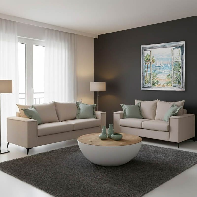 - Χρώμα καναπέ και μαξιλαριών πλάτης: Cream - Φέρει δύο διακοσμητικά μαξιλαράκια σε μέντα χρώμα στον διθέσιο και δύο στον τριθέσιο καναπέ.