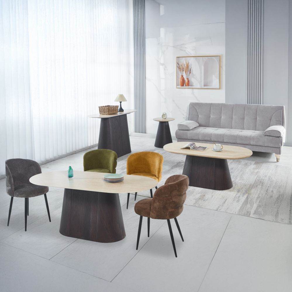 Το σετ 4τμχ CATER θα προσφέρει ομοιομορφία και συμμετρία στον χώρο σας και αποτελείται από δύο τραπεζάκια, ένα σαλονιού σε οβάλ σχήμα κι ένα στρογγυλό βοηθητικό, ένα οβάλ τραπέζι τραπεζαρίας και μια οβάλ κονσόλα, όλα της ίδιας σειράς. Διαθέτουν κεραμικές επιφάνειες σε χρωματισμό ΠΕΤΡΑΣ ΤΡΑΒΕΡΤΙΝΑΣ, και βάσεις από MDF σε ΣΚΟΥΡΟ ΚΑΦΕ χρώμα.