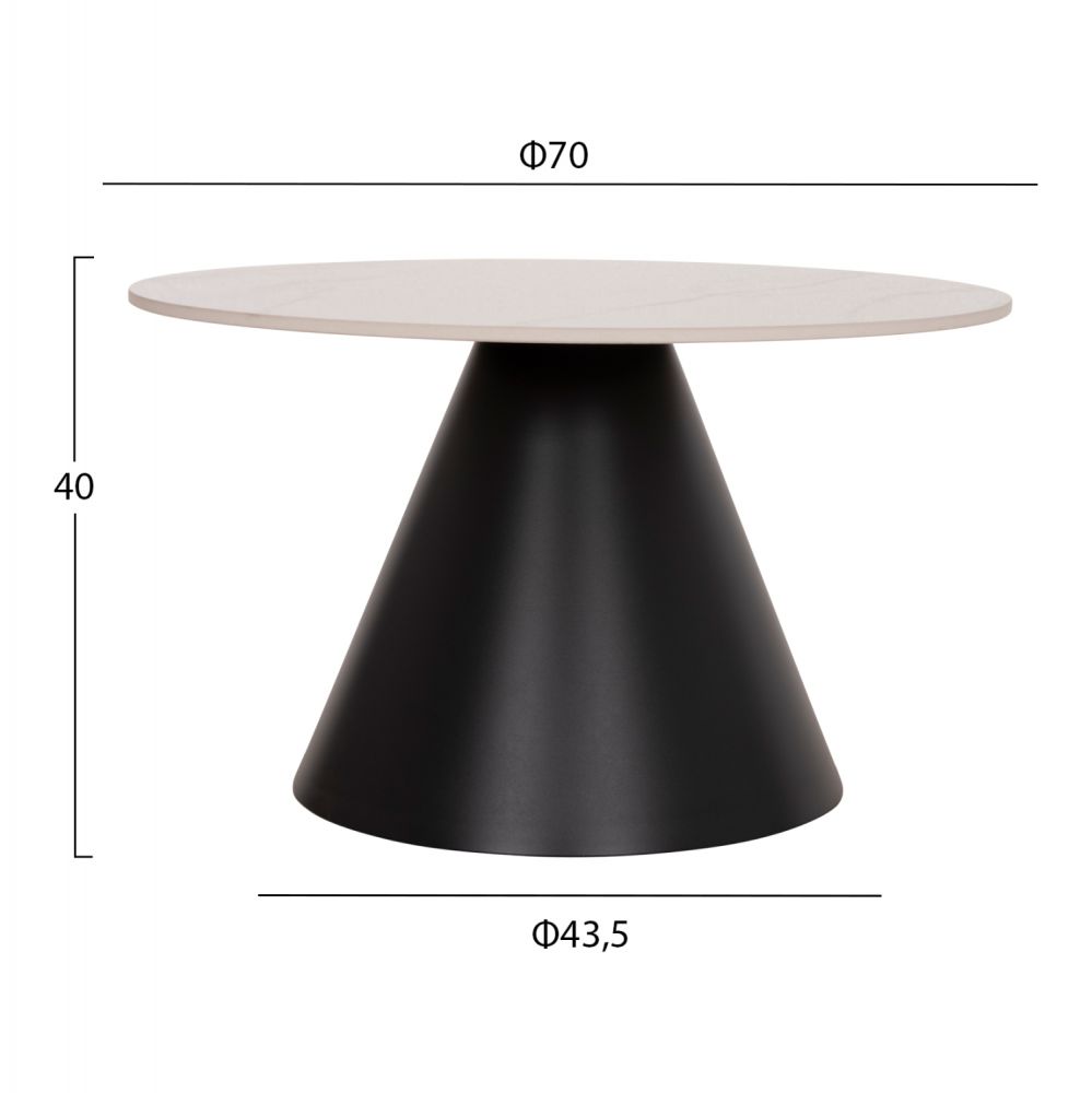 Αυτό το σετ τραπεζιών για το σαλόνι αποτελείται από 2 μεταλλικά τραπεζάκια στρογγυλά διαφορετικών μεγεθών. Οι βάσεις τους έχουν σχήμα κώνου σε ΜΑΥΡΟ ματ χρώμα, ενώ οι επιφάνειες είναι κατασκευασμένες από γυαλιστερό sintered stone σε χρωματικό σχήμα CALACATA GOLD. Ιδανικά τόσο για το σπίτι, όσο και για επαγγελματικούς χώρους.