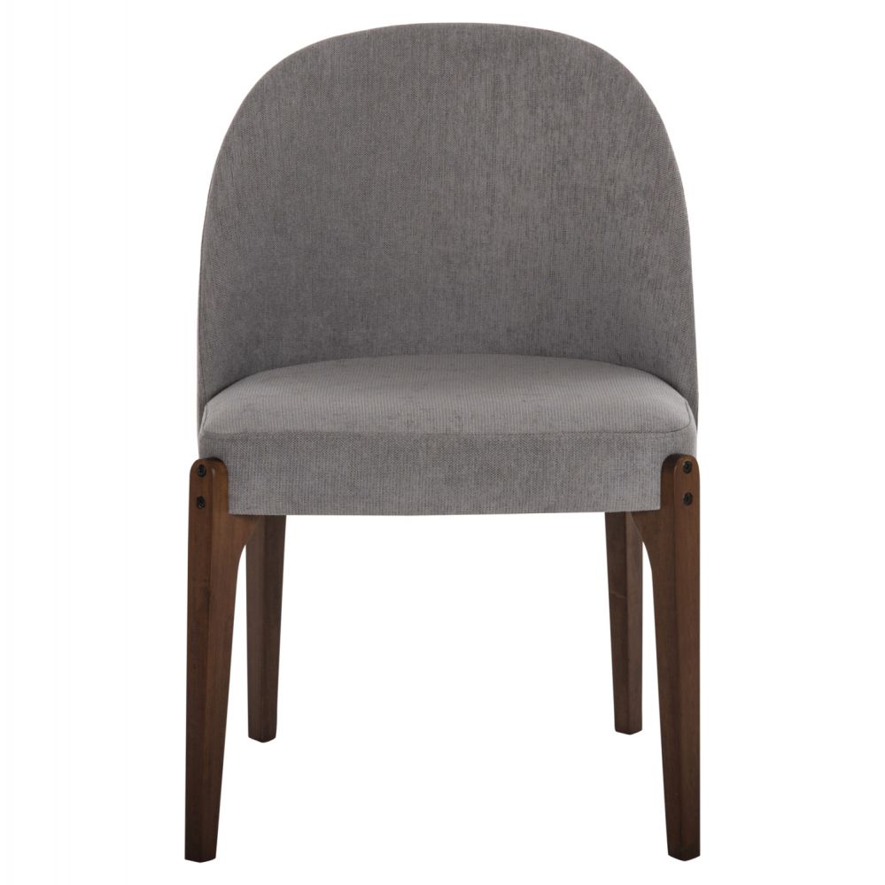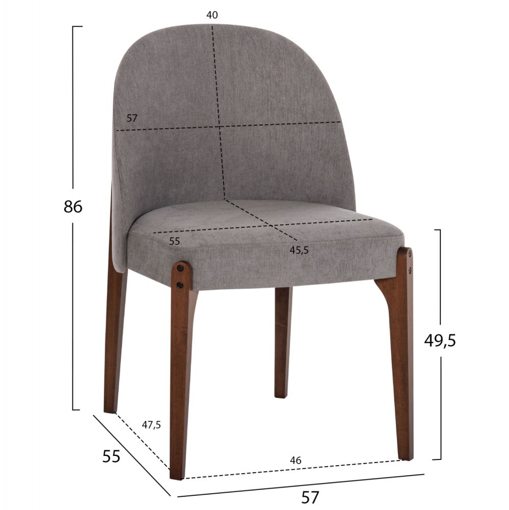 Ένα ορθογώνιο τραπέζι με ιδιαίτερο χαρακτηριστικό ότι η απόχρωση της φαλτσοκομμένης επιφάνειας αλλά και των ποδιών/βάσεων είναι ΣΚΟΥΡΑ ΚΑΡΥΔΙ σε sunburst τεχνοτροπία του καπλαμά φράξινου, και 6 καρέκλες από ποιοτικό μασίφ rubberwood (καουτσουκόδεντρο) σε ΚΑΡΥΔΙ χρώμα με επένδυση από ύφασμα σε ανοιχτό ΓΚΡΙ χρώμα.