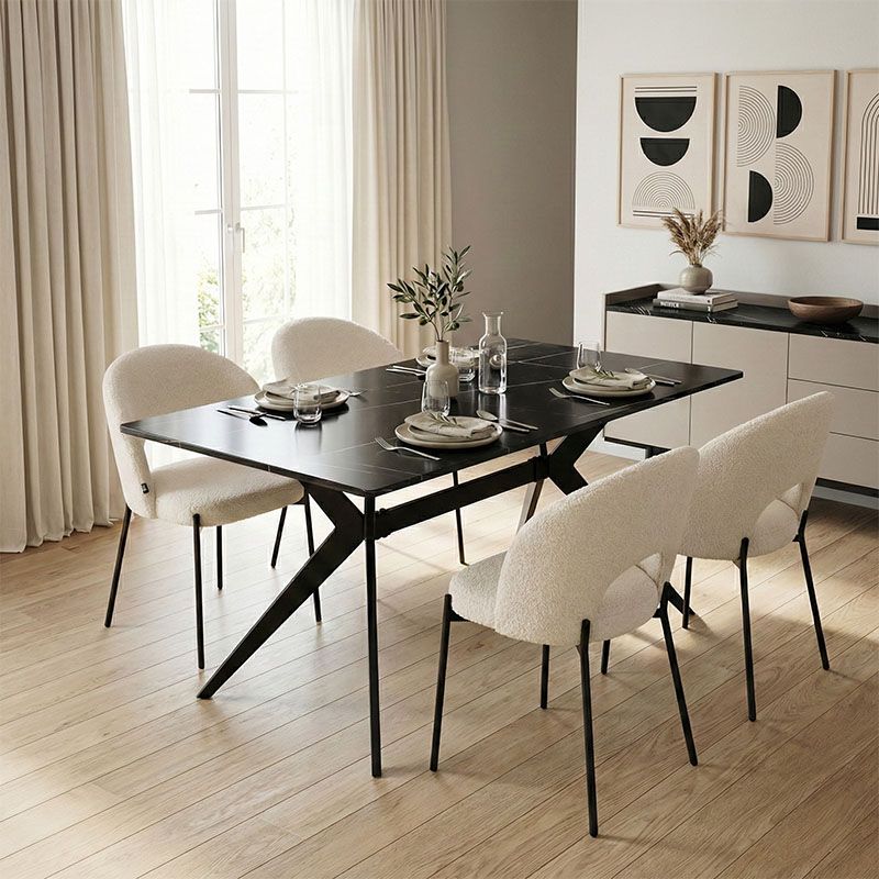Δώστε στον χώρο σας έναν αέρα μοντέρνας κομψότητας με αυτό το εντυπωσιακό σετ τραπεζαρίας Ezali - Masebo. Η επιφάνεια με την όψη μαρμάρου προσδίδει πολυτέλεια και φυσικότητα, ενώ η τολμηρή, μαύρη μεταλλική βάση με τα διασταυρούμενα πόδια και την κεντρική ενίσχυση, αποτελεί ένα ξεχωριστό αρχιτεκτονικό στοιχείο που μαγνητίζει τα βλέμματα.