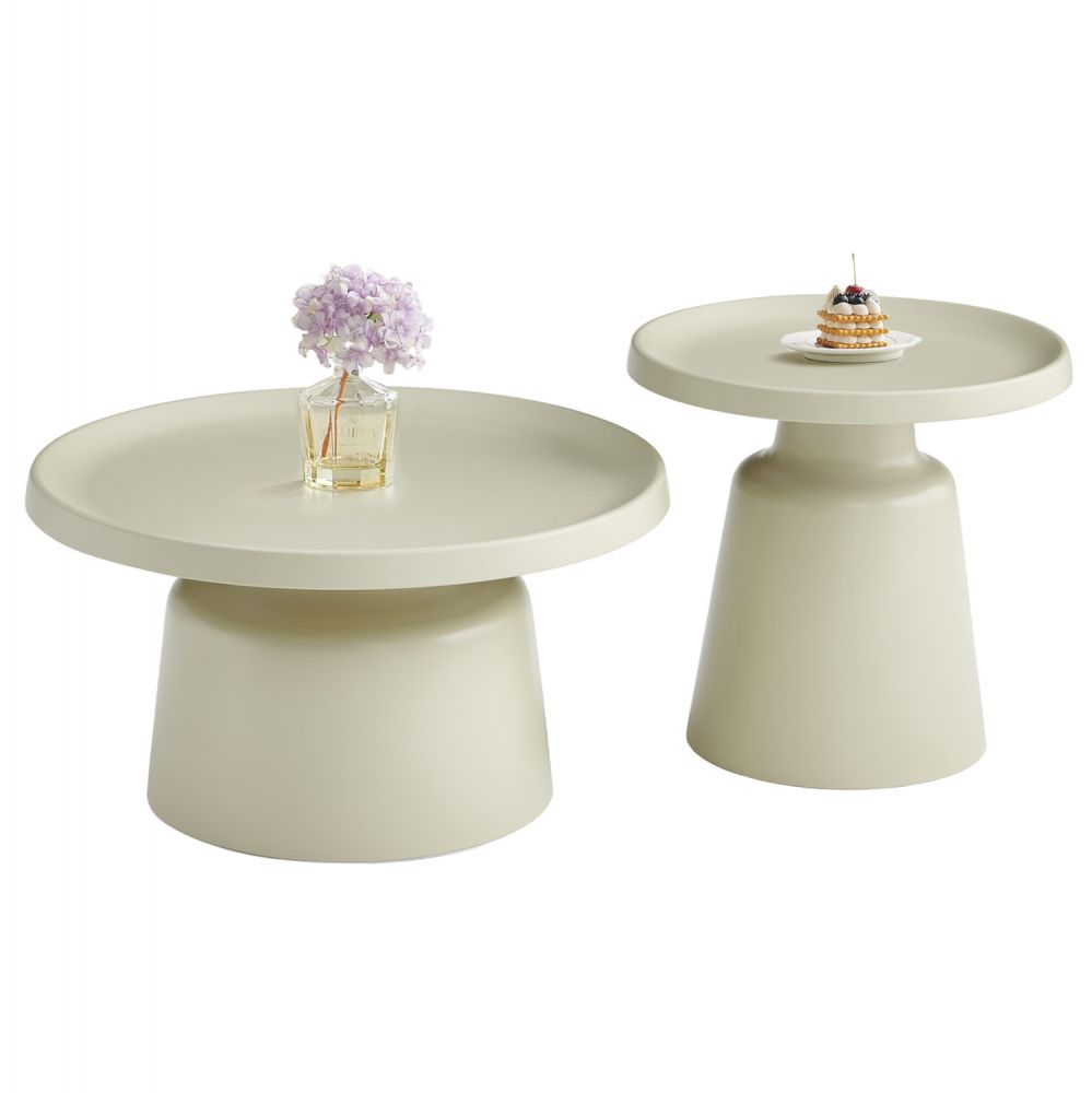 Αυτό το σετ 2 τραπεζιών για το σαλόνι είναι πανέμορφο και πρακτικότατο. Πρόκειται για 2 εξολοκλήρου μεταλλικά τραπεζάκια στρογγυλά διαφορετικών μεγεθών σε ΣΑΜΠΑΝΙ χρώμα. Το ένα έχει κωνική βάση που καταλήγει σε όμορφο «λαιμό», και το άλλο έχει κυλινδρική σχεδόν βάση. Ιδανικά τόσο για το σπίτι, όσο και για επαγγελματικούς χώρους.
