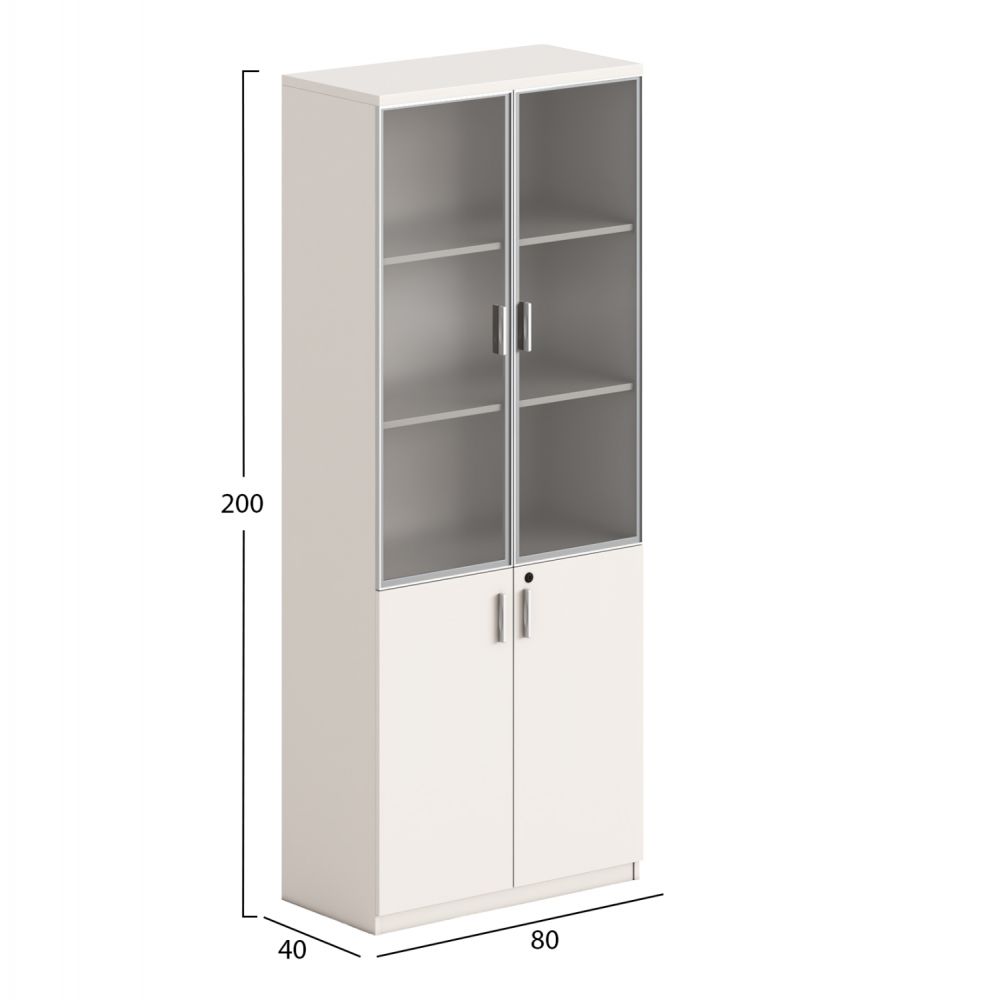 Στο επάνω μέρος διαθέτει γυάλινες πόρτες που κλείνουν δύο ράφια, ιδανικά για προβολή βιβλίων, φακέλων ή διακοσμητικών στοιχείων. Το κάτω μέρος φέρει πόρτες σε ανοιχτό καφέ χρώμα με κλειδαριά, οι οποίες κλείνουν ένα ράφι, προσφέροντας ασφάλεια για έγγραφα και προσωπικά αντικείμενα.