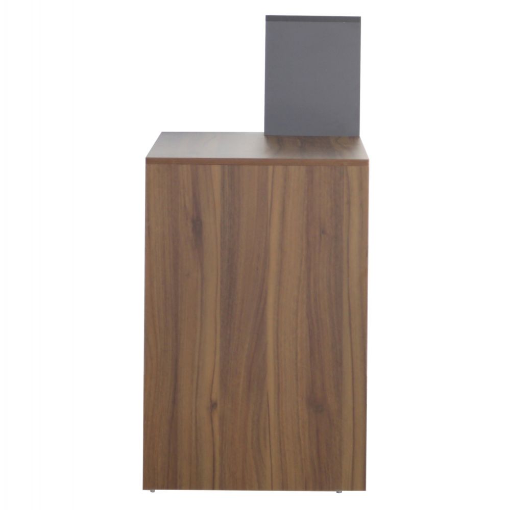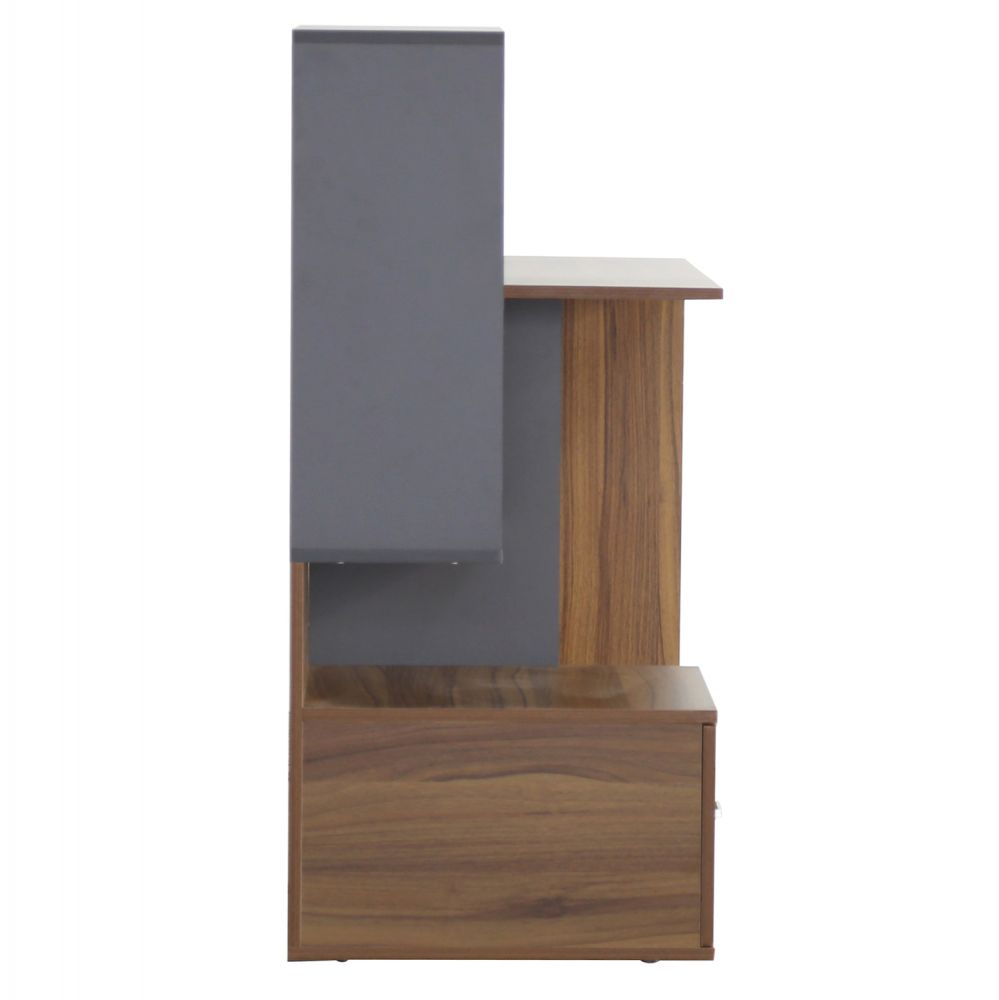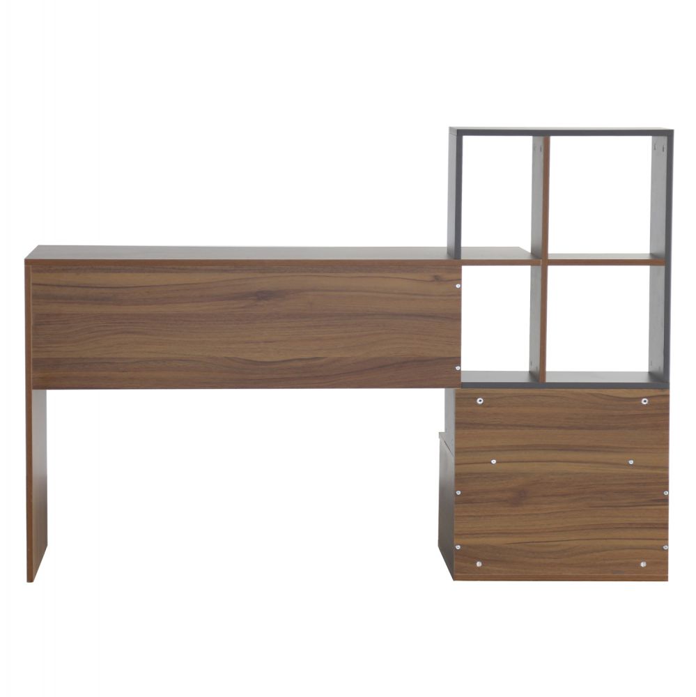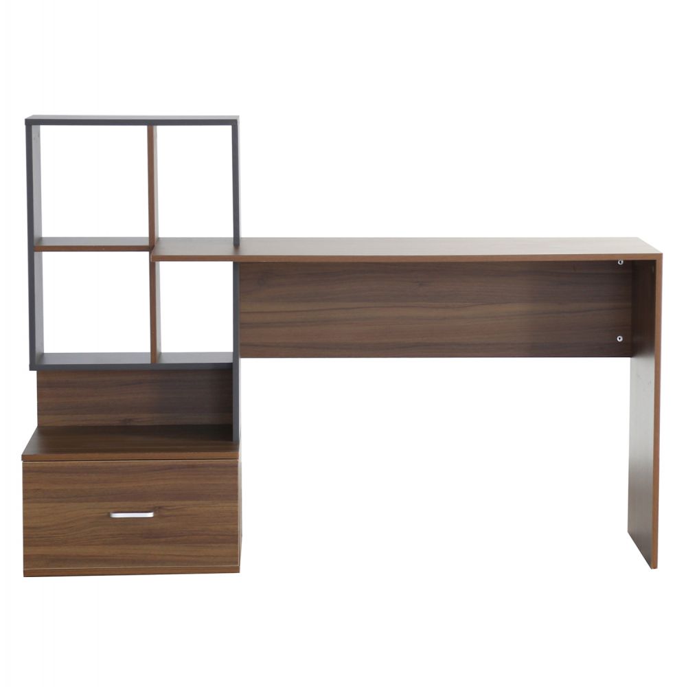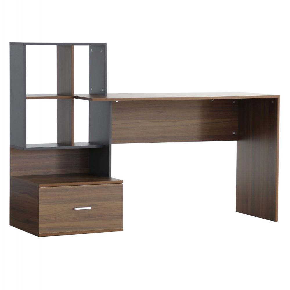 Μοντέρνο γραφείο με ενσωματωμένη βιβλιοθήκη, κατασκευασμένο από μελαμίνη υψηλών προδιαγραφών, σε διακριτική διχρωμία από καρυδί και γκρι απόχρωση.