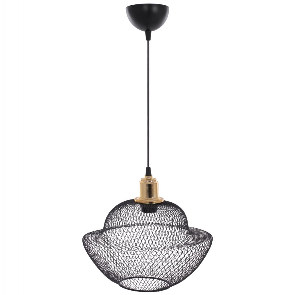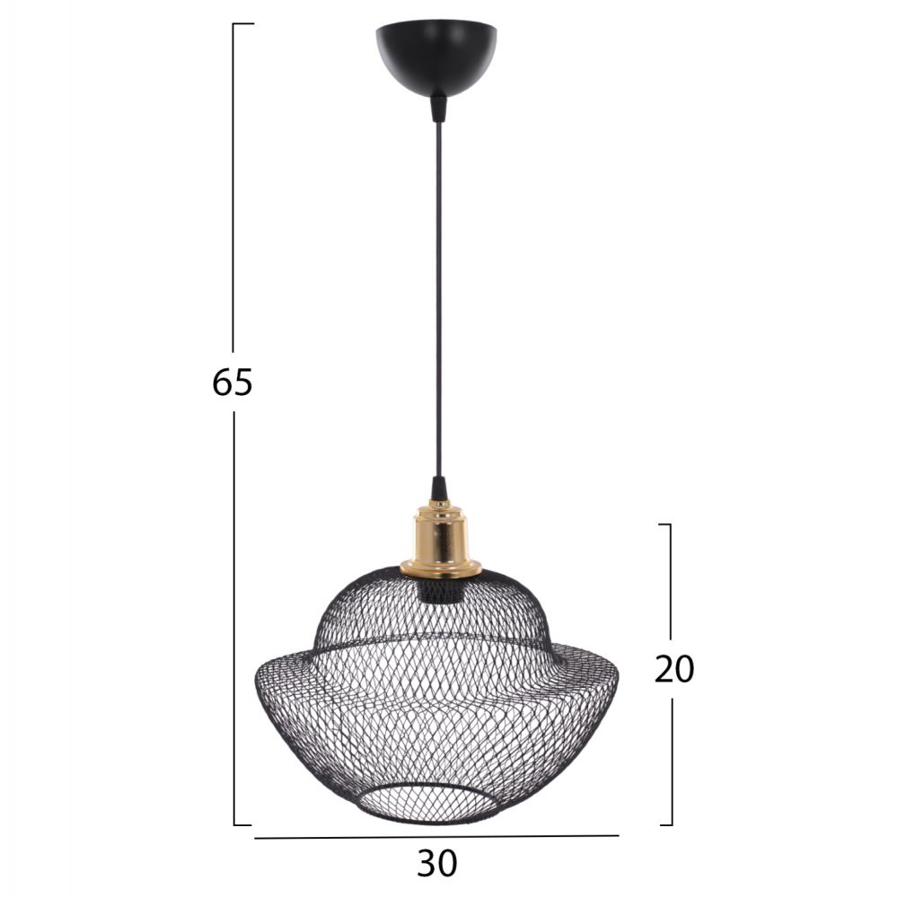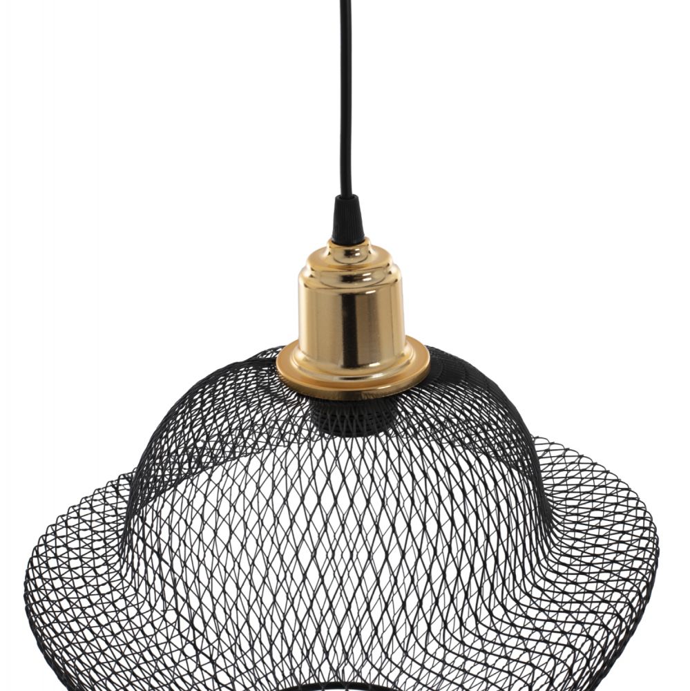 Hm7690.01-κρεμαστό ----Αφήστε το φως να απλωθεί στον χώρο με ένα πρωτότυπο και φινετσάτο μονόφωτο οροφής, ολοκληρώνοντας την διακόσμησή σας. Το «καπέλο» του φωτιστικού αποτελείται από ένα πυκνό μεταλλικό πλέγμα σε μοντέρνο και ιδιαίτερο σχήμα και είναι η επιτομή του μοντέρνου design. Η διαφορετική «πινελιά» αυτού του κρεμαστού μονόφωτου είναι το χρυσό ντουί του λαμπτήρα το οποίο είναι λουστραρισμένο δίνοντας μια αίσθηση πολυτέλειας.